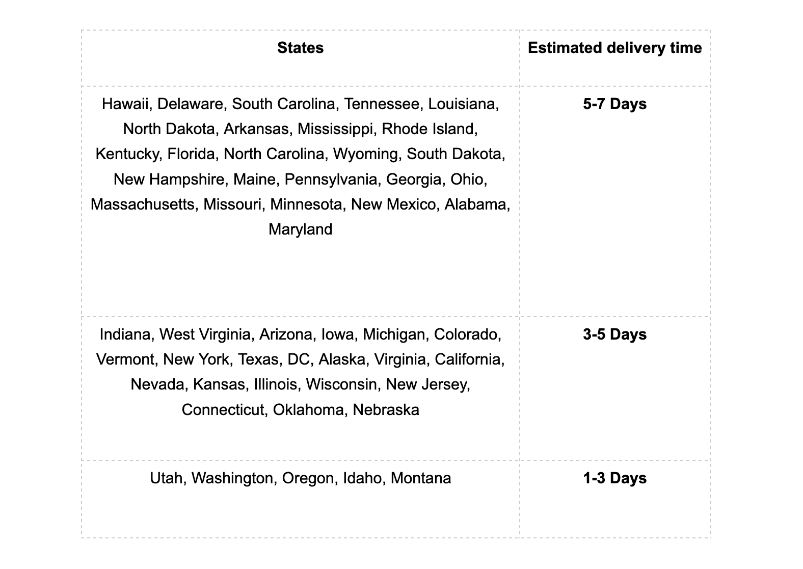 Your order will be shipped and delivered based on the reference guide below. Please note that these are delivery estimates, and do not include processing time for orders. Orders are processed and shipped during business hours only, and do not include weekends or holidays.
